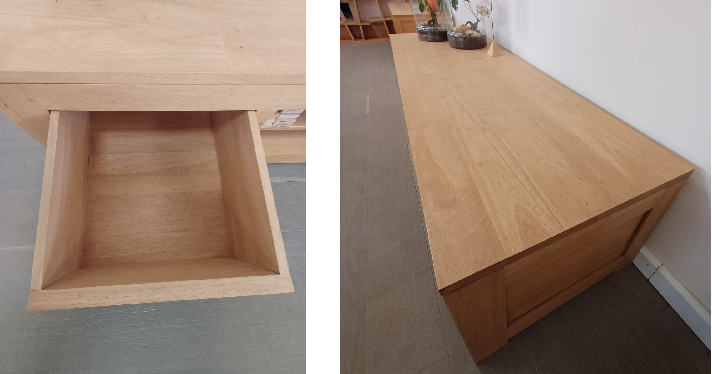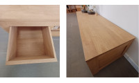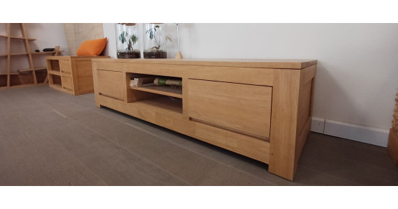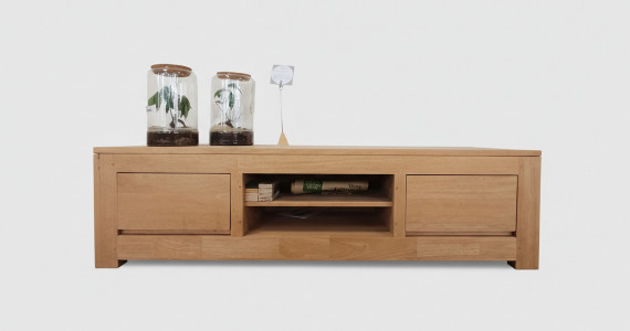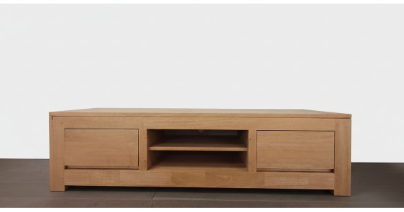 Voici un meuble TV écologique en bois massif huilé conçu pour recevoir votre TV, votre lecteur DVD, votre box tout en offrant 2 tiroirs de rangement.