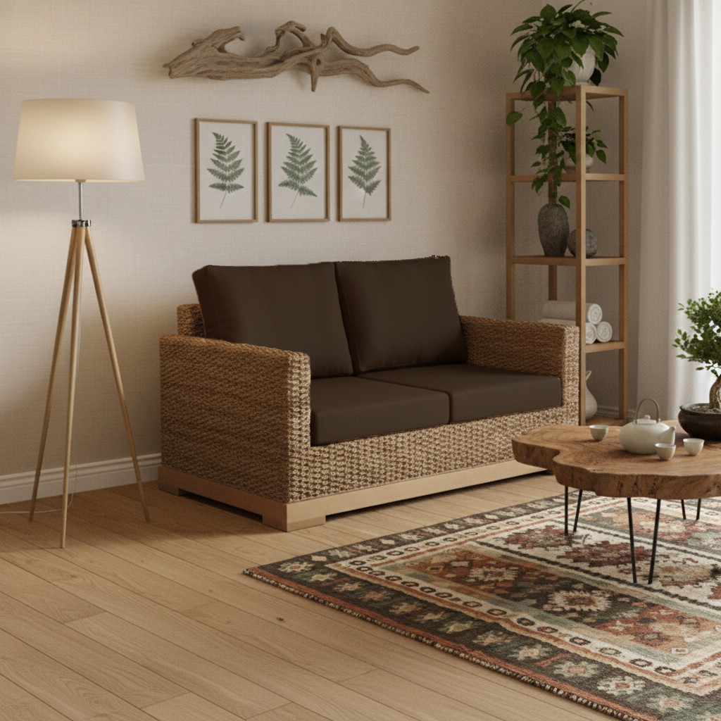 Ce canapé 2 places, en jacinthe d'eau naturelle tressée est caractérisé par ses lignes épurées, intemporelles pour une ambiance relaxante. Ecologique, il bénéficie d'un revêtement en tissu certifié bio (GOTS), d'un piètement en hêtre issu de forêts gérées françaises, de mousses en latex naturel également certifié bio. Voici un meuble éco-conçu qui conjugue confort et esthétisme au naturel !