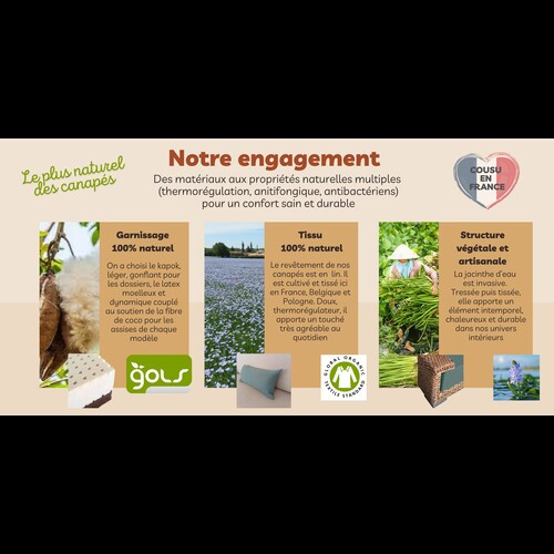 Afin de satisfaire une demande de plus en plus fréquente et ô combien légitime pour l'emploi de matériaux naturels et écologiques dans la fabrication de meuble, nos canapés sont maintenant livrés avec des assises 100% bio en latex naturel et fibre de coco caoutchoutée issus de plantations certifiées bio.