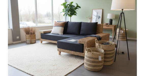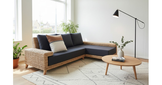 Ce canapé d'angle contemporain en jacinthe d'eau naturelle tressée, revétu de tissu et doté de mousses en latex naturel certifiés bio (GOTS), est écologique et résolument contemporain. Son look emprunté aux canapés design avec sa ligne basse, ses larges accoudoirs et ses pieds alu brillant reste toutefois très chaleureux grâce à la matière naturelle. Voici un meuble éco-conçu très actuel !