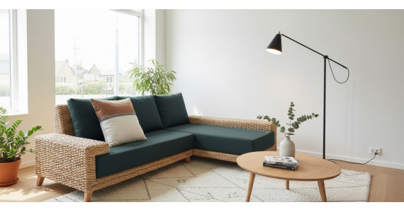 Ce canapé d'angle contemporain en jacinthe d'eau naturelle tressée, revétu de tissu et doté de mousses en latex naturel certifiés bio (GOTS), est écologique et résolument contemporain. Son look emprunté aux canapés design avec sa ligne basse, ses larges accoudoirs et ses pieds alu brillant reste toutefois très chaleureux grâce à la matière naturelle. Voici un meuble éco-conçu très actuel !