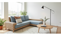 Ce canapé d'angle contemporain en jacinthe d'eau naturelle tressée, revétu de tissu et doté de mousses en latex naturel certifiés bio (GOTS), est écologique et résolument contemporain. Son look emprunté aux canapés design avec sa ligne basse, ses larges accoudoirs et ses pieds alu brillant reste toutefois très chaleureux grâce à la matière naturelle. Voici un meuble éco-conçu très actuel !