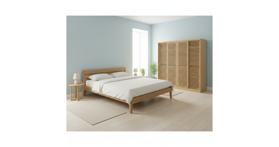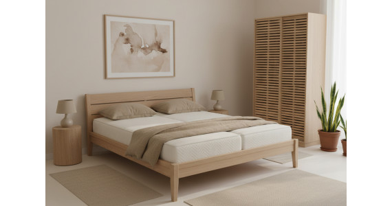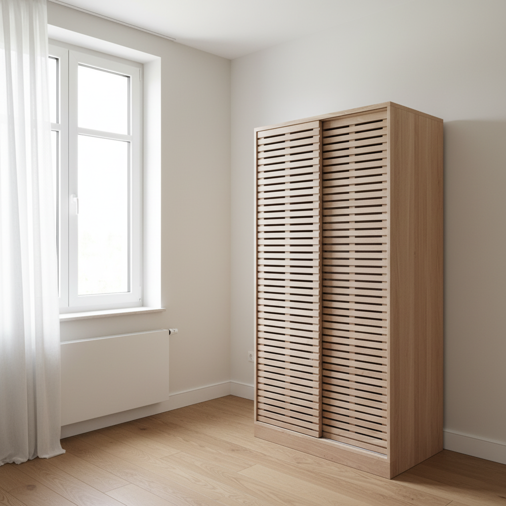Voici un grand dressing en bois massif huilé. Il se ferme en apportant une touche de bois très décorative comme un paravent.