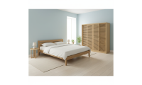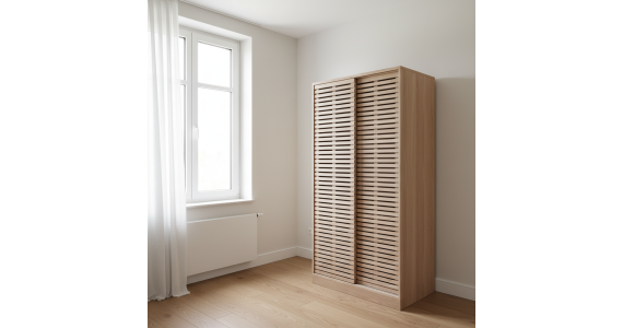 Ce dressing offre un grand volume de rangement avec sa penderie centrale et ses étagères de chaque côté. Ses portes en bois massif façon claire-voie très présentes habilleront votre chambre en lui apportant une touche très actuelle.