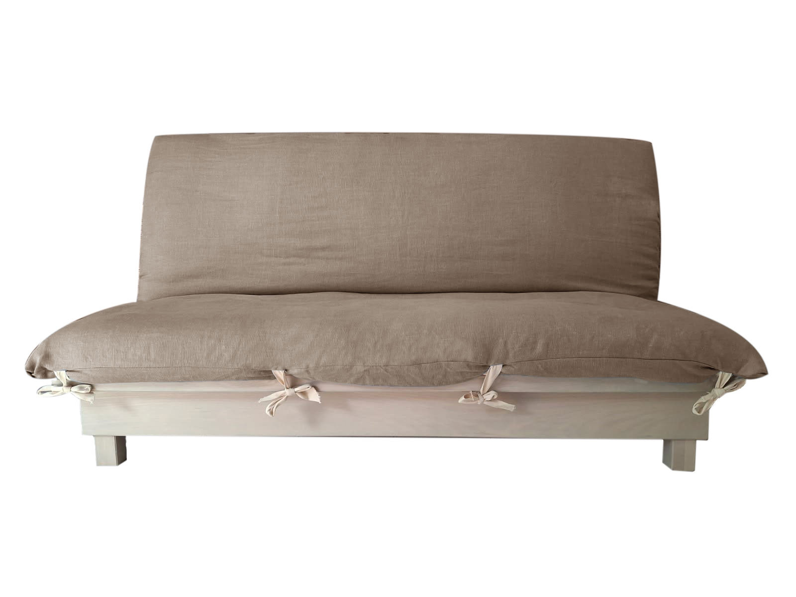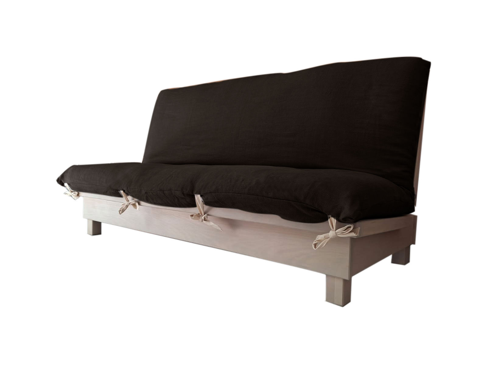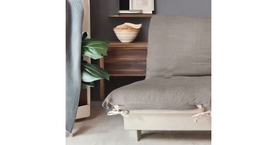 Le futon est attaché à la structure grâce à 8 lanières ; la housse en lin est conçue avec des passants qui laissent passer les lanières.