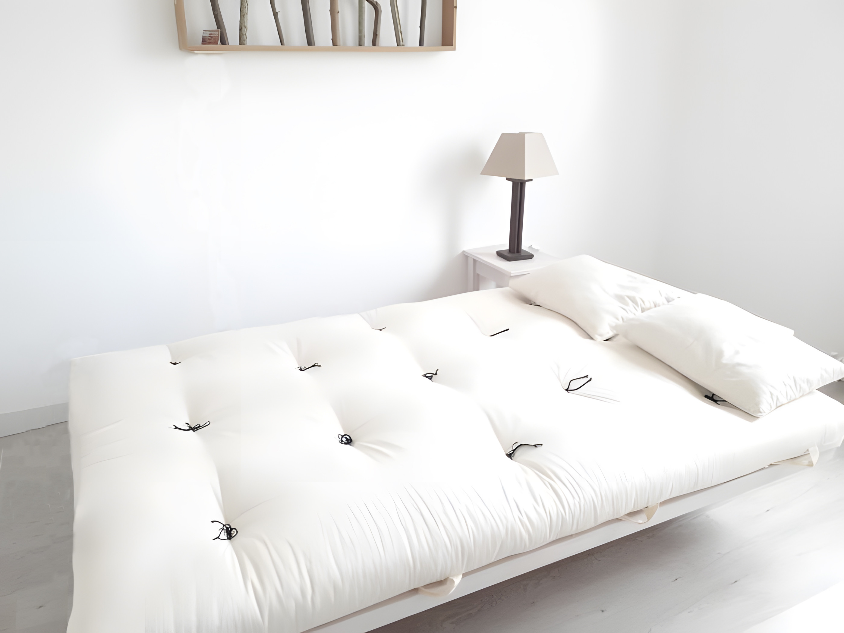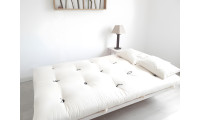 Cette banquette est équipée d'un matelas futon confort - ce dernier est en effet composé d'un morceau de latex enrobé dans du coton. Le latex apportera un confort plus structurant et moelleux que celui d'un futon classique. Il se plie toutefois facilement pour assurer la fonction canapé. Epaisseur totale du futon 12cm donc 4 cm de latex pur lait d'hévéa au centre.