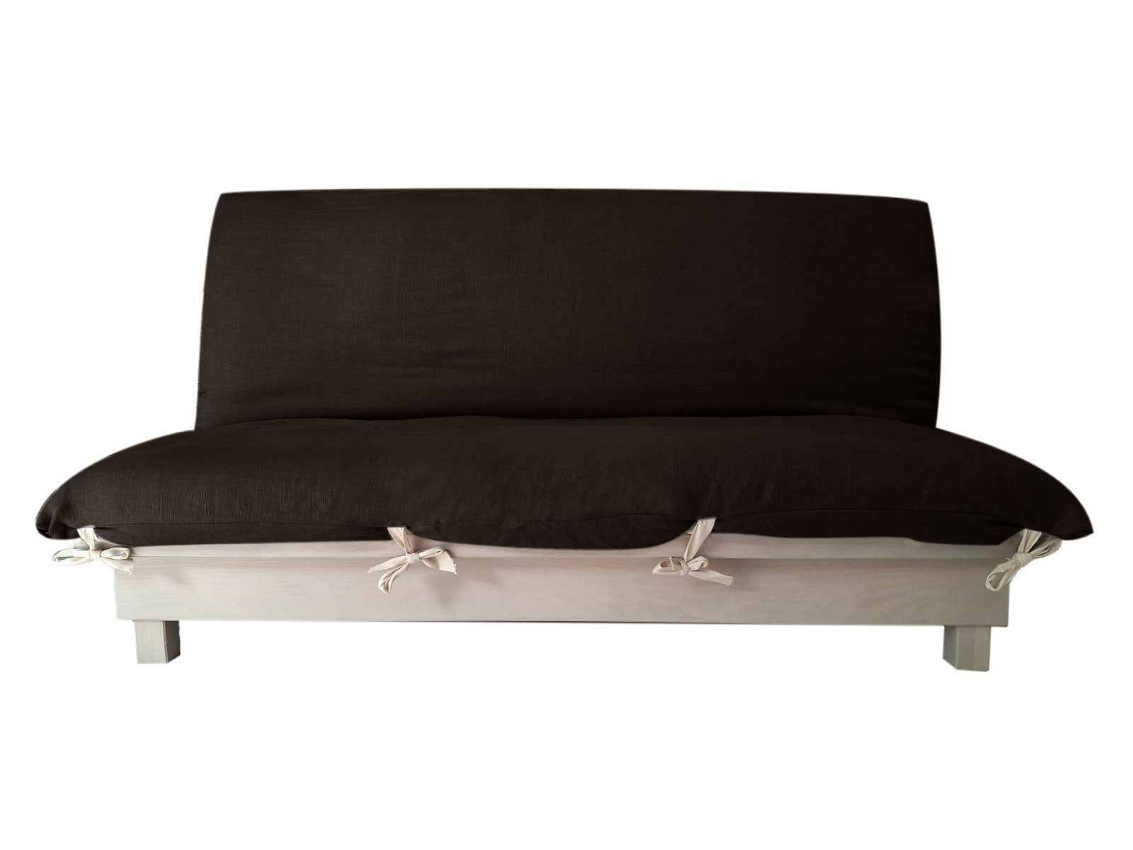 Le futon est attaché à la structure grâce à 8 lanières ; la housse en lin est conçue avec des passants qui laissent passer les lanières.