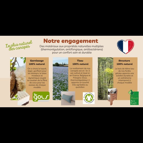 Vous avez la possibilité d'équiper votre canapé de housses confectionnées dans notre lin ou chanvre que nous proposons pour l'ensemble de nos canapés, un tissu d'ameublement certifié bio décliné en plusieurs coloris au choix.