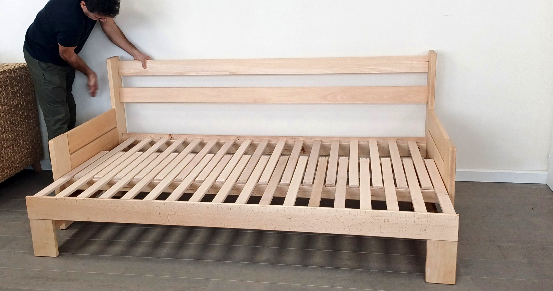 Sa structure est fabriquée dans le Sud Ouest en hêtre massif français et sa finition écologique.